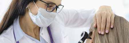 ENT doctor conducts medical examination of ear with otoscope closeup