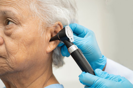Otolaryngologist or ENT physician doctor examining senior patient ear with otoscope, hearing loss problem.