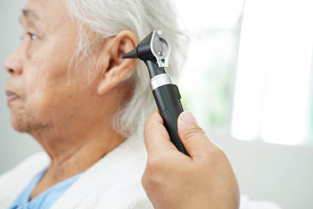 Otoscope with ear model for otolaryngologist or ENT physician doctor examining senior patient ear, hearing loss problem.