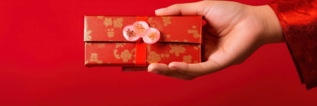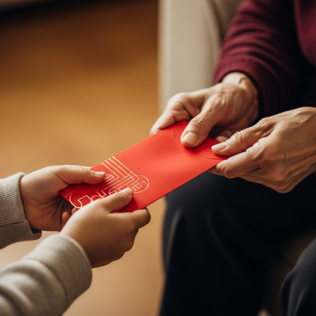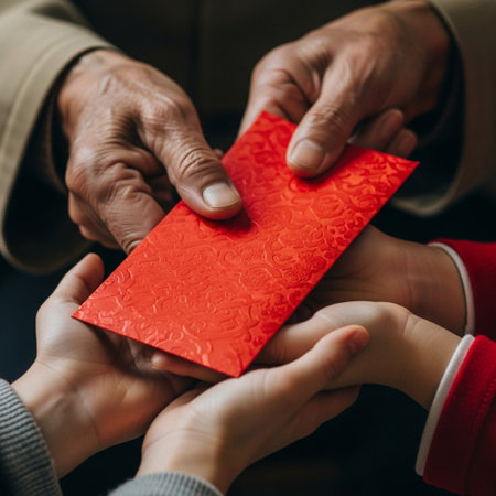 A square, hyper-detailed close-up focusing on the hands during a traditional Lunar New Year Hongbao