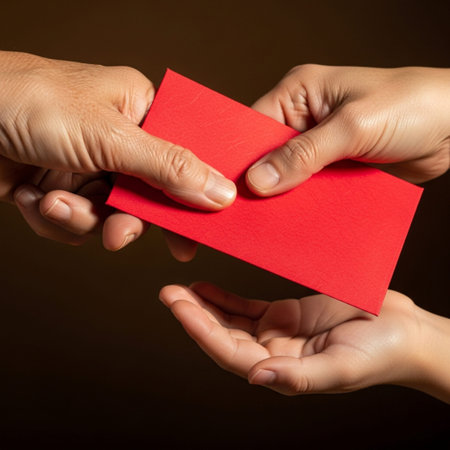 A dramatic, vertical close-up of hands exchanging traditional red envelopes (Hongbao) between an adu