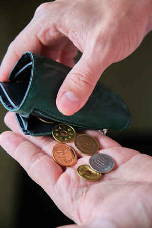 Hand holding a wallet with yen coins. Cash, tax, recession, economy, inflation and crisis concepts.
