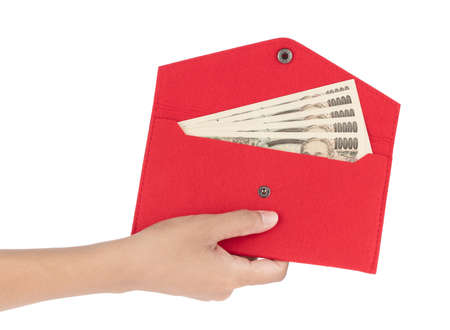Hand holding wallet with Japanese Yen isolated on a white background