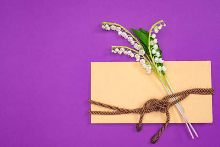 A message or greeting card with spring flowers. Lilies of the valley on an envelope with a cord. Spring flowers and an envelope on a lilac background. Romantic greeting.