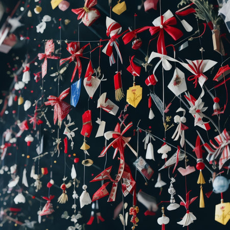 A vibrant arrangement of colorful paper squares tied with strings, featuring decorative tags, set against a rustic background.