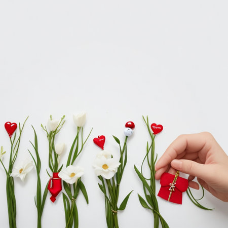 Female hand holding a red gift box with a red heart and white tulips on a white background