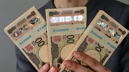 Woman hand holding Japanese Yen banknote stack. Thousand Yen money. Japan cash, Tax, Recession Economy, Inflation, Investment, finance and shopping payment concepts