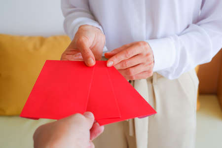 close up hand of Caucasian woman receive bonus or salary or money with red envelope is happily, Chinese new year concept