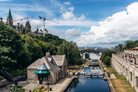 Ottawa, Canada - August 13, 2025: Wide view of the Rideau Canal locks with stone buildings, pathways, and people walking along the water, with the Ottawa River