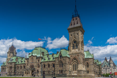 Ottawa, Canada - October 14, 2018 : Parliament Hill in Ottawa, Canada. Facade view of Centre Block and East Block of Canadian Parliamentary complex in autumn