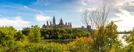 Panorama of Canadian Parliament in Ottawa and river in a sunny day, Canada