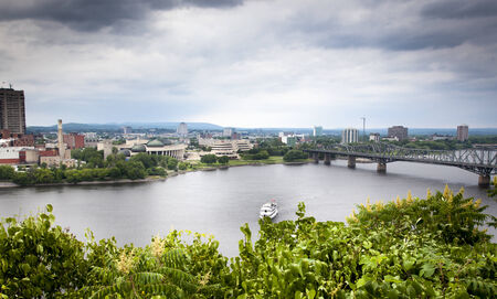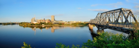 Canada, Ottawa - May 23, 2021: Panoramic view of Ottawa River and Alexandra Bridge from Ottawa to Gatineau city of Quebec, Canada on a sunny summer day