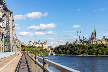 Ottawa, Canada - August 2, 2021: Alexandra Bridge from Gatineau city of Quebec to Ottawa and Canadian Parliament on sunny summer day