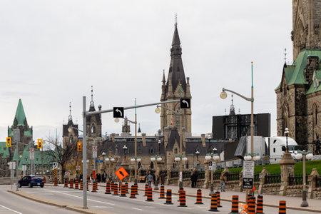 Ottawa, Canada - November 11, 2022: Wellington street closed for cars in downtown near Parliament Hill buildings.