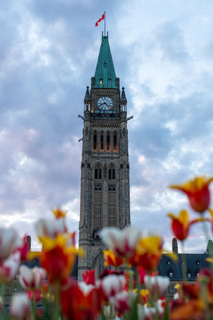 Parliament of Canada with tulips in Ottawa, during Canadian Tulip Festival in spring