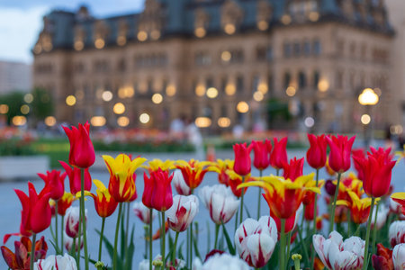 Tulips in downtown in spring. Tulip festival in Ottawa, Canada. Cityscape with blooming flowers in springtime.