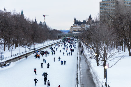 Ottawa, Canada - February 8, 2025: People ice skating on Rideau Canal in winter.