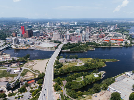 Ottawa, Canada - October 14, 2021: Portage Bridge between Ottawa, Ontario and Gatineau, Quebec in Canada. City view from Major's Hill Park in fall season. Victoria Island.