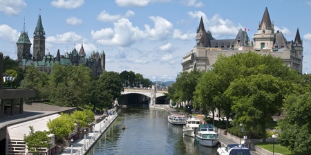 The canadian Parliament, the Fairmont Chateau Laurier hotel and the Rideau canal in Ottawa, Canda