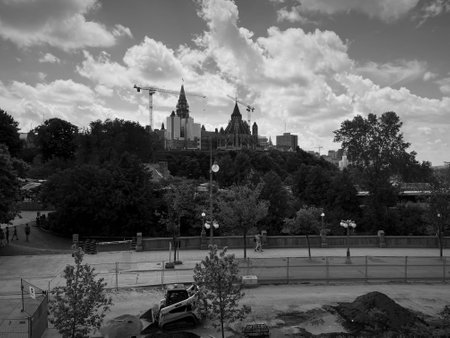Ottawa, Canada - August 13, 2025: View of the Centre Block and Peace Tower under renovation on Parliament Hill