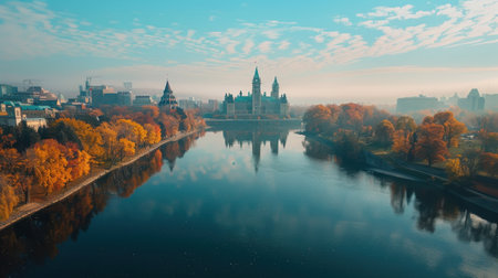A beautiful city with a river running through it. The river is calm and the water is clear. The buildings in the background are tall and majestic. The sky is blue and the sun is shining