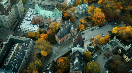 A city view with many buildings and trees. The buildings are mostly brown and white
