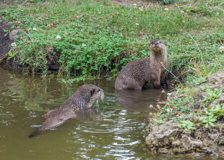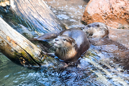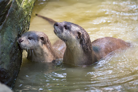 Couple of Aonyx or Ambionyx cinereus Small-Clawed Otter in pond