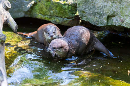 Couple of wet otters after swimming near the water