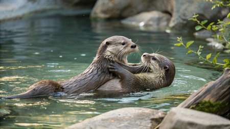 Playful otters splashing in scenic river surrounded by nature.