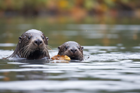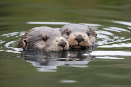 Two lively otters swim together in a tranquil body of water, showcasing their playful interaction and close bond in a peaceful aquatic setting.