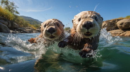 Two otters enjoy playing in the water, with one otter splashing around and creating a beautiful spray of water droplets in the sunlight. Generative AI