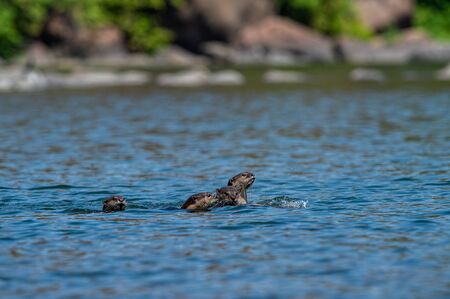River Otter Lontra canadensis siblings playing in a river water in spring.