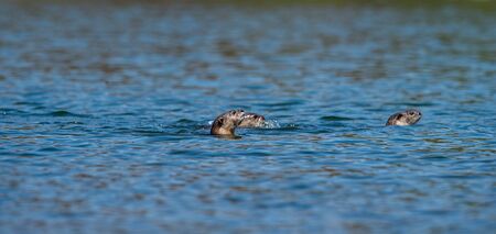 Smooth-coated otter or Lutrogale pers family playing in blue water of ramganga river at jim corbett national park, uttarakhand, india