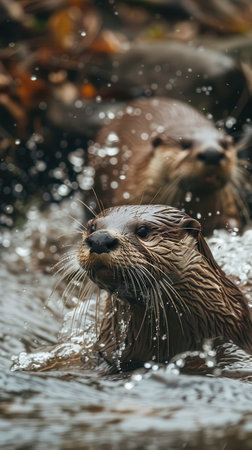 Two cute otters playing in a flowing stream surrounded by nature in a vibrant setting