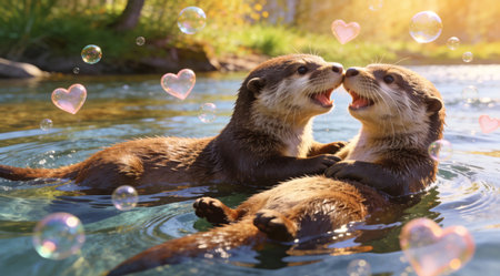 Two adorable otters, hand in paw, drift serenely on a tranquil waterway Their heartwarming bond, captured in this intimate moment, speaks volumes of love and affection found in the wild Witness the magic of nature as these playful creatures celebrate their connection in a breathtaking display of otter affection AI Generative
