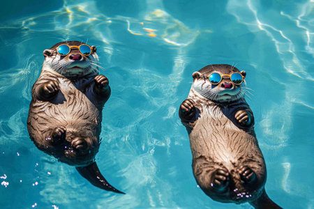 Two playful otters are floating on their backs in a vibrant blue lagoon, both wearing tiny matching sunglasses. The setting is bright and cheerful, embodying a delightful summer atmosphere.