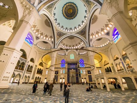 Inside interior and dome of Camlica Mosque. The new mosque and the biggest in Istanbul. Located on the beautiful Buyuk Camlica Tepesi hill, April 22, 2020, istanbul, Turkey