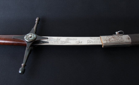 Ukrainian Cossack saber in a scabbard, with the inscription (For freedom, for destiny) close-up on a black background
