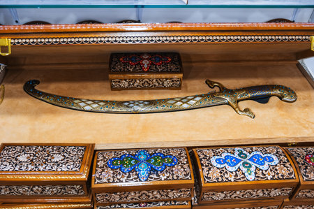 traditional Arabic Uzbek saber and wooden carved caskets in souvenir shop in Uzbekistan