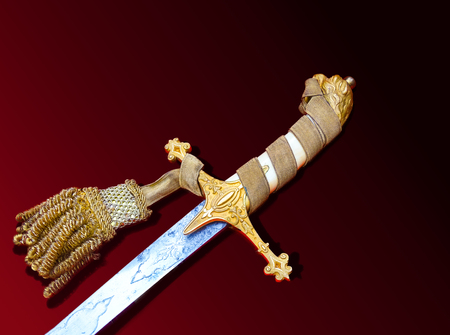 Sword on a dark background with spotlight and copy space. Medieval weapon.
