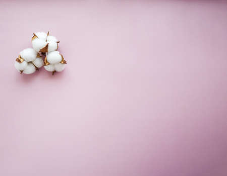 Cotton flowers on the light pink background with copy space. Floral composition, top view.