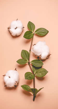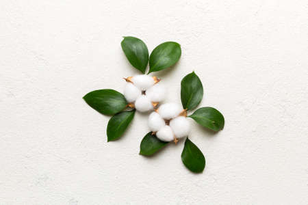 Autumn Floral Flat lay background composition. Dried white fluffy cotton flower branchwith green leaf top view on colored table with copy space.