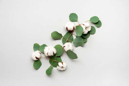 Beautiful cotton flowers and eucalyptus leaves on light background