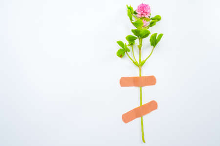 Background with a pink clover flower. A clover flower is attached to the wall with a medical plaster. Designer background with clover. Field flower and place for text.