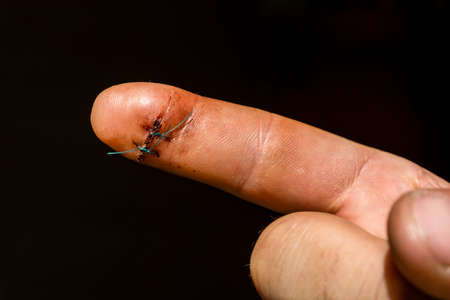 Postoperative sutures on the finger of the hand .. Stitches on the injured finger. Photo taken under artificial light