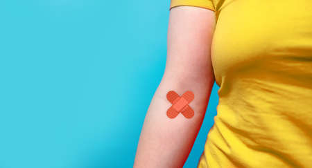blood donation. Blood donor with patch bandage after giving blood on a blue background. World blood donor day and save life concept.