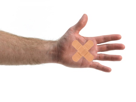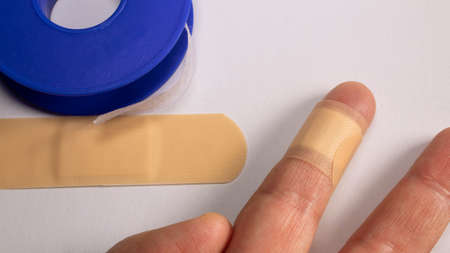 Man placing bandage or adhesive plaster on his thumb finger. plaster on the wound