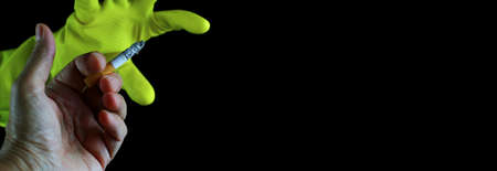 the doctor's hand in gloves and wearing jewelry holds a syringe with a needle up, on a blue background