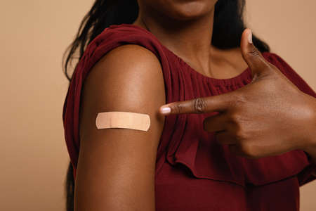 woman with adhesive plaster on shoulder vaccine passport immunity health