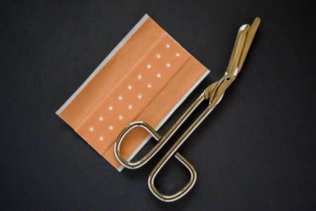 Adhesive bandage against a black background. Medical adhesive bandage stock image. Image of medical plaster glued like a cross